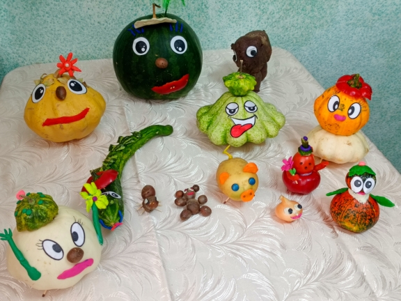 Наши подопечные с большим вдохновением творили настоящие произведения искусства. С помощью фантазии и немного навыков создали оригинальные поделки из привычных овощей. Кому-то удалось сделать животных из картофеля, моркови, свеклы,перца, а кто-то создал забавные лица из лука, патиссона, арбуза и тыквы.